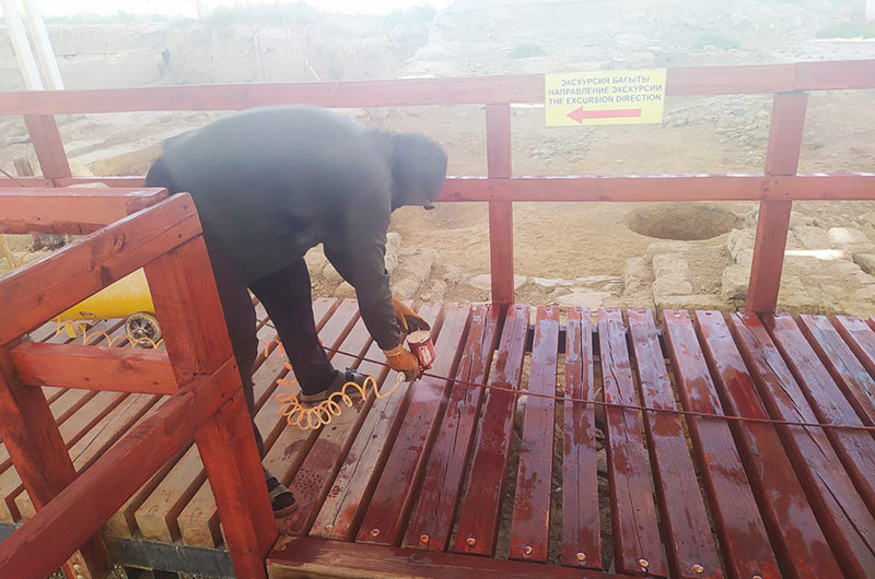 Бүгін "Ежелгі Тараз ескерткіштері" тарихи-мәдени музей-қорығының қызметкерлерімен "Көне Тараз" ашық аспан астындағы археологиялық саябақ аумағында қазба орындарын тазалау және экскурсиялық жолдарды сырлау жұмыстары жүргізілді.