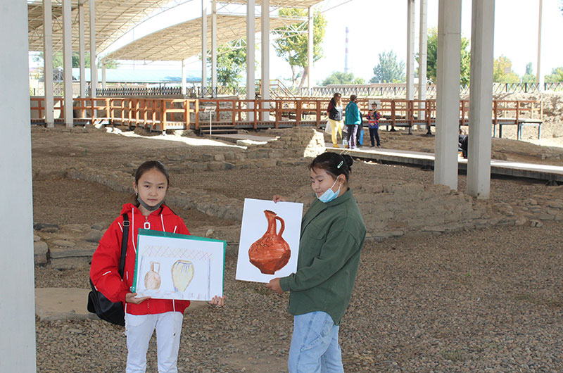 Балаларға «Көне Тараз» ашық аспан астындағы археологиялық саябақтың мысалында ортағасырлық Тараз қаласының тарихымен таныстырды. Сабақ барысында балалар археологиялық парктің құрылу тарихымен танысты.Еске сала кетсек 2011 жылы басталған археологиялық қазба жұмыстары қаланың мыңжылдық тарихы барын дәлелтейтін құнды жәдігерлерлермен толыққан болатын. Соның ішінде VI-XII ғасырларға жататын шамамен 4 мыңдай артефакт және де мешіт, медресе, ортағасырлық монша, керуен сарайлар, көне Талас өзені сағасының жағасы, тұрғын үйлердің іргетастары табылды. Осындай тарихи құндылықтарды өз көздерімен тамашалаған оқушылар үлкен әсер ала отырып, көне қалашықтан табылған жәдігерлердің суретін салуға кірісті. Іс-шара соңында қатысушы балалар мен ұстаздар ыстық ықыластарын білдіре отырып, алғыстарын айтты.