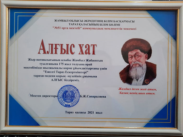 «Ежелгі Тараз ескерткіштері» мемлекеттік тарихи-мәдени қорық - музейінің қызметкерлері Жамбыл облысы әкімдігінің білім басқармасы, Тараз қаласының білім бөлімі №51 орта мектебіне Жамбыл Жабаевтың туылғанына 175 жыл толуына орай «Жыр патшалығының алыбы» атты тақырыпта жылжымалы көрме ұйымдастырылды. Көрменің мақсаты ақынның шығармаларын кеңінен насихаттау, ел бірлігін жырлаған жырлары арқылы жас ұрпақты отаншылдық сезімге баулу. Сонымен бірге тарих қойнауынан бүгінгі күнге дейін жеткен – Ежелгі Тараз қалашығынан табылған құнды да бірегей жәдігерлерімізбен таныстырылды. Мектеп ұжымы алғысын білдіріп, мектеп директоры Б.Ж. Сапаралиева Алғыс хатпен марапаттады.