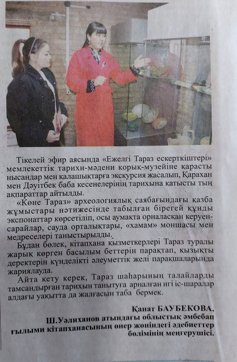 Облыстық "Ақ жол" газетінің жаңалықтар беттерінде «Тарихи шаһардың тағылым тереңде» атты тақырыпта мақала жарыққа шықты. (2 наурыз 2022 жыл №25(19134)).