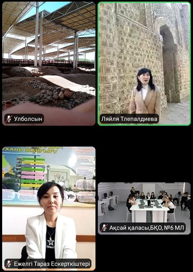 Батыс Қазақстан облысы әкімдігі білім басқармасының Бөрлі ауданы білім беру бөлімі Ақсай қаласының №6 мектеп-лицейінің білім алушыларына «Ұлт болашағы саналы ұрпақ» атты («Zoom» платформасы арқылы) онлайн экскурсия жүргізілді. Музей-қорығының қызметкерлері білім алушыларға арнайы өткізілген экскурсияда тарихы тереңнен тамыр тартатын Әулиеата өңірінде орналасқан «Айша бибі», «Қарахан» кесенесі және шаһардың шырайын кірігізіп, ажарын ашып тұрған «Көне Тараз» этномәдени кешенін назарларына ұсынды. Сонымен қатар экскурсия барысында тарихи-мәдени мұраларымызды насихаттай отырып, Тараз шаһарының тарихымен және археологиялық қазба жұмыстары нәтижесінде табылған құнды экспонаттарды көрсетіп,сипаттамларына тоқталып, таныстырылды.