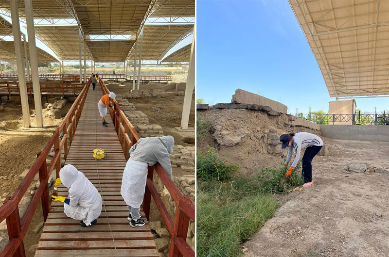 Бүгін "Ежелгі Тараз ескерткіштері" тарихи-мәдени музей-қорығының қызметкерлерімен "Көне Тараз" ашық аспан астындағы археологиялық саябақ аумағында қазба орындарын тазалау және экскурсиялық жолдарды сырлау жұмыстары жүргізілді.