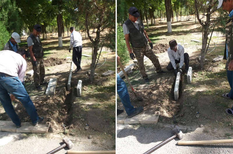 «Қарахан» және «Дәуітбек» кесенелерінің аумағында тазалық жұмыстарын жүргізу әлі де жалғасуда. Бүгін "Ежелгі Тараз ескерткіштері" тарихи-мәдени қорық-музейінің қызметкерлері біріге отырып, білек сыбана кірісіп кесенелердің аумағында санитарлық тазалау,арықтар жүйелерін тазарту, тал түптерін балақтау, әктеу, күл-қоқыстан тазарту жұмыстарын жүргізді.