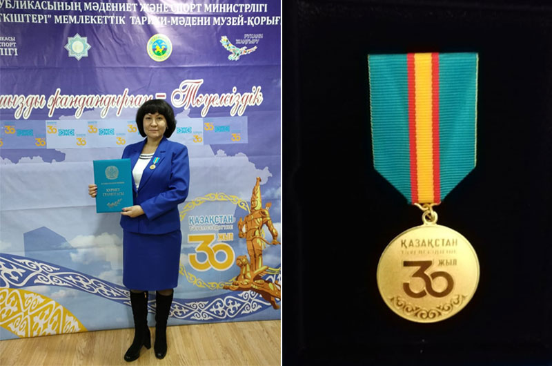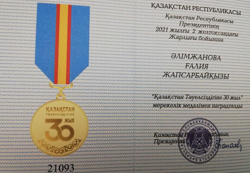 Қазақстан Республикасынның Мәдениет және спорт министірлігіне қарасты «Ежелгі Тараз ескерткіштері» мемлекеттік тарихи-мәдени музей-қорық директорының ғылыми жөніндегі орынбасары Әлімжанова Ғалия Жапсарбайқызын «Қазақстан Тәуелсіздігіне 30 жыл» медалінің табысталуымен құттықтай отырып, игі істеріңіздің қашанда оңға басуына, әр қадамыңыздың қарымды болуына, ел - қоғам алдында абыройыңыздың арта беруіне тілектестік білдіреді! Сізге еңбекте толағай табыстарға, мақсатта биік шыңдарға жете беруіңізді және әрдайым отбасыңыз аман, жүзіңіз жарқын, мерейіңіз үстем болуына шын жүректен тілектеспіз!