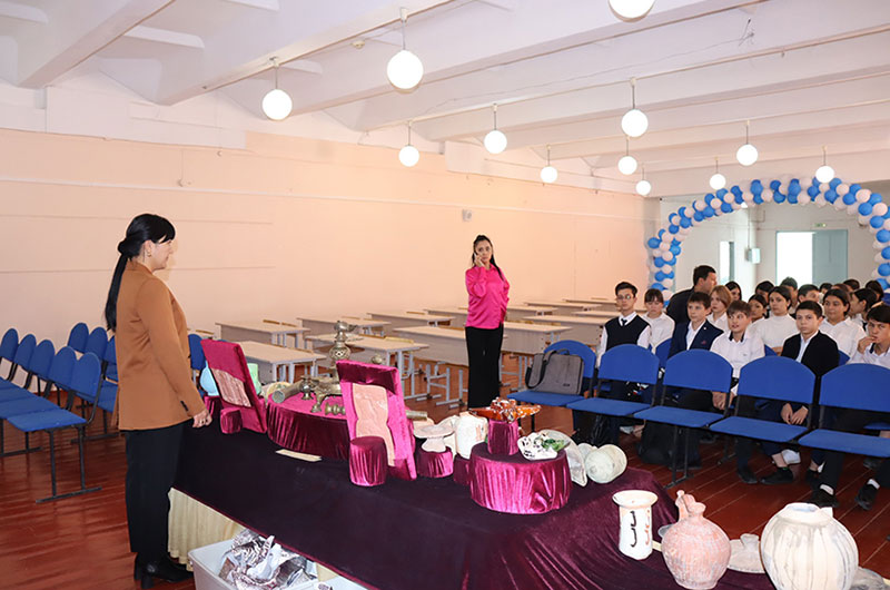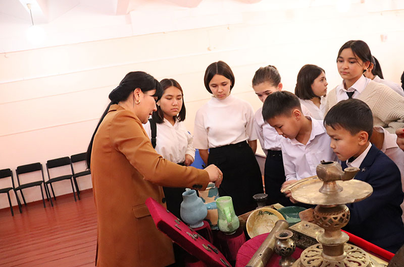 Сондай-ақ оқушылар назарына археологиялық қазба жұмыстары нәтижесінде Тараз қалашығынан табылған құнды жәдігерлер ұсынылды. Атап айтсақ, әр кезеңде басылған тиындар, мөр-таңбалар, көптеген құнды тарихи жәдігерлер: қазандар, табақтар, құмандар, шырағдандар, құмыралар сияқты заттардың тарихымен танысты. Құнды жәдігерлерді ұрпақтан-ұрпаққа жеткізіп, насихаттау және дәріптеу жұмыстарын жүргізу басты мақсат болып табылады. Мектеп ұстаздары мен оқушылары жылжымалы көрмеден алған әсерлерін таңданыспен жеткізе отырып, музей ұжымына алғыс білдірді.