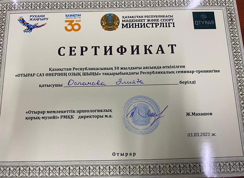 Ел Тәуелсіздігінің 30 жылдығына орай бүгін Отырар мемлекеттік қорық-музейінде «Отырар саз өнерінің озық шыңы» тақырыбында семинар-тренинг өткізілді. Осыған орай аталған шараға «Ежелгі Тараз ескерткіштері» тарихи-мәдени музей – қорығының қызметкерлері тәжірбие алмасу мақсатында қатысты. Семинар-тренингте жалпы тақырыптар, ортағасырдағы керамика өңдірісінің дамуы, керамикалық жәдігерлерді қайта қалпына келтірудің бүгінгі тәсілдері және осы қолданбалы өнердің жалғасы жөнінде қамтылды. «Отырар саз өнерінің озық шыңы» атты семинарға қатысушы музей-қорық қызметкерлері Оспанова Алия, Алимханова Ұлболсын Сертификаттармен марапатталды.