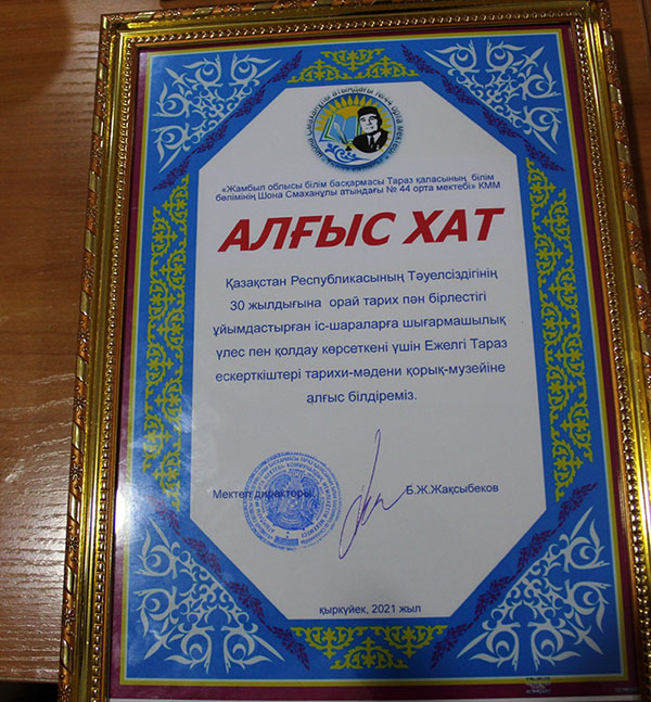 "Ежелгі Тараз ескерткіштері" тарихи-мәдени қорық-музейінің қызметкерлері Тәуелсіздігіміздің 30 жылдық мерей тойына орай қалалық Шона Смаханұлы атындағы №44 орта мектепте "Тәуелсіздік тұғырым" атты іс-шараға қатысты. Іс-шара аясында тарихи-мәдени мұрамызды өскелең ұрпаққа насихаттау және таңыстыру мақсатында "Рухани құндылықтарымыздың 30 жылдықтағы жетістіктері" атты тақырыбында музей қорынан жасақталған ерекше туындылардан жылжымалы көрме 300-ден астам білім алушыларға көрсетілді.